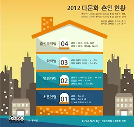 2012년 다문화 인구동태(혼인관련) 2012년 다문화 인구동태통계 다문화인구동태통계는 다문화가정의 혼인, 이혼, 출생, 사망에 관한 통계입니다. 다문화가족은 귀화·인지에 의한 국적취득자와 외국국적자가 포함된 가족을 말합니다. 기초자료는 혼인, 이혼, 출생, 사망의 신고서와 가족관계등록자료를 활용하였습니다. 2012년 다문화 혼인, 이혼은 감소한 반면에 다문화 출생, 사망은 증가 다문화 혼인은 국제결혼 건전화 조치 등으로 감소추세이고, 최근 다문화 혼인이 줄어들어 다문화 이혼도 감소하였습니다. 다문화 출생과 사망의 증가는 다문화 혼인이 누적되어 다문화가족 규모가 증가하여 나타난 현상으로 보입니다. 우리나라 전체 인구동태통계에서 차지하는 비중은 다문화 혼인이 8.9%, 이혼은 혼인 비중보다 높은 12%, 출생은 혼인의 절반 수준인 4.7%, .. 더보기